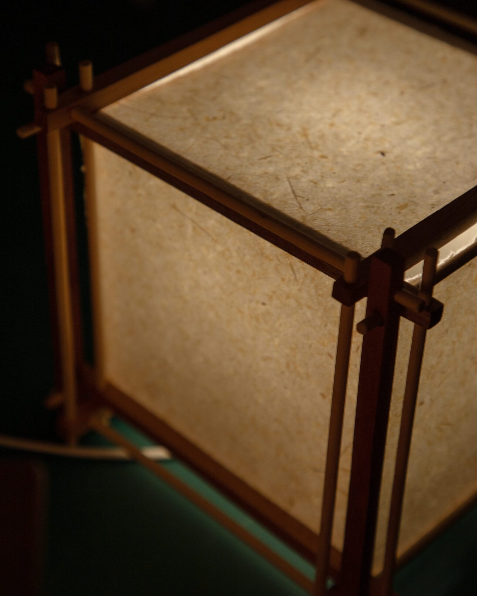 Lámpara modelo Q-VO de 32 piezas de madera y bambú, encastradas, sin pegamento ni clavos, con pantalla de papel artesanal a base de fibras de formio color crudo.