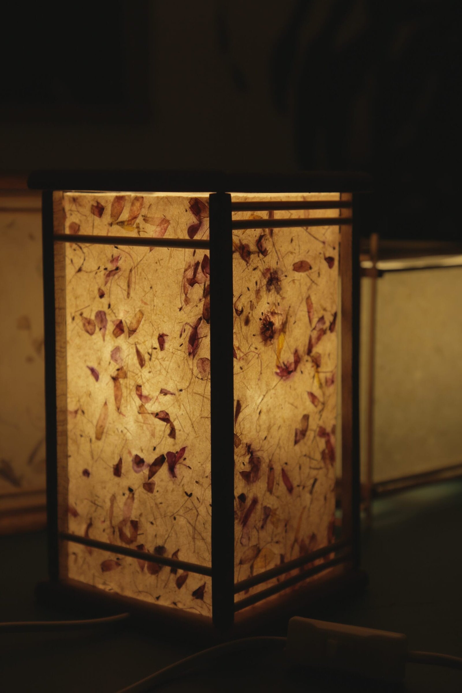 Lámpara modelo M1 de 16 piezas de madera y bambú, con pantalla de papel artesanal a base de fibras vegetales e inclusión de pétalos.